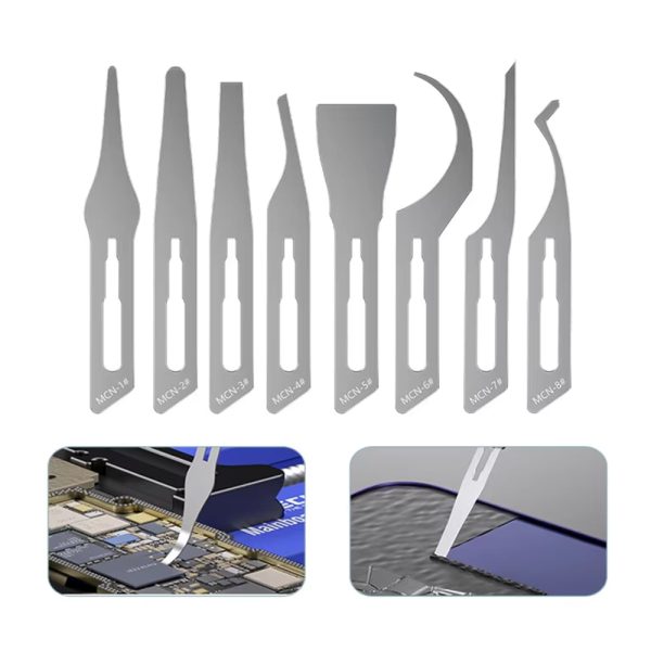 Набір лез для зняття компаунду Mechanic 008 призначений для професійного ремонту електроніки. Використовується для акуратного видалення компаунду, клею та залишків захисних матеріалів з чіпів BGA, мікросхем і материнських плат смартфонів, планшетів та ноутбуків. Підходить для ручного полірування та тонких сервісних робіт без пошкодження компонентів.