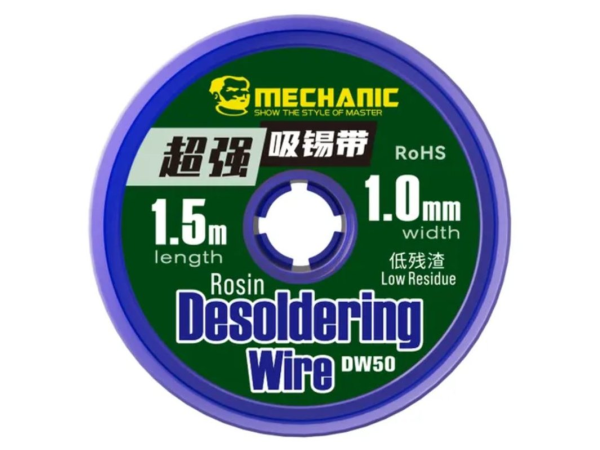 Оплетка Mechanic DW50 1015 (1mm / 1.5m) призначена для відпаювання компонентів та видалення надлишків припою з друкованих плат. Вона ефективно поглинає припій, що допомагає очищати контакти та запобігати коротким замиканням під час ремонту електроніки.