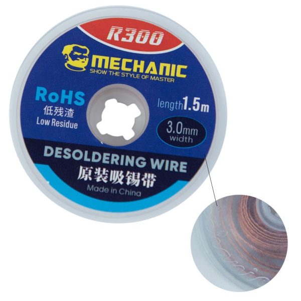Оплетка Mechanic R300 3015 (3.0mm / 1.5m) призначена для відпаювання компонентів та видалення надлишків припою з друкованих плат. Виготовлена з високоякісних імпортних матеріалів, вона забезпечує швидке та ефективне очищення поверхні, що допомагає запобігти коротким замиканням і забезпечує високу якість ремонту.