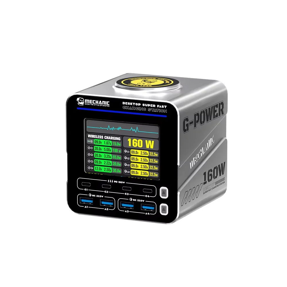 Зарядний пристрій Mechanic G-Power (4 PD USB-C + 4 QC USB-A) 160W призначений для швидкої та одночасної зарядки до 8 різних гаджетів. Підходить як для майстерень з ремонту електроніки, так і для домашнього використання, дозволяючи живити смартфони, планшети, ноутбуки, а також інші пристрої, які підтримують швидку зарядку.